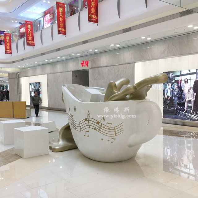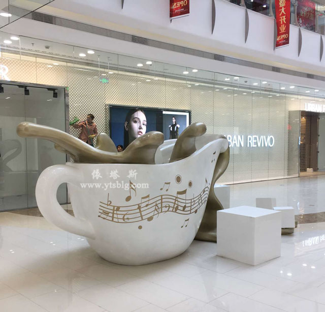 銀川新華聯(lián)購物中心玻璃鋼咖啡杯雕塑美陳藝術(shù)裝置型號為DS422,咖啡杯杯體長3200mm,咖啡流動狀裝飾長1600mm,整體長為4800mm;高1800mm,寬度按比例制作。咖啡杯美陳藝術(shù)玻璃鋼雕塑整體采用高品質(zhì)玻璃鋼制作而成,做噴濺流動狀藝術(shù)造型達(dá)到動感逼真效果,表面彩繪五線譜音符圖做亮光效果,彰顯了高規(guī)格、高品位現(xiàn)代休閑氛圍,玻璃鋼咖啡杯雕塑達(dá)到美陳藝術(shù)裝置銀川新華聯(lián)購物中心咖啡主題文化的目的。