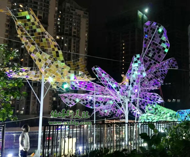 ? 結(jié)合來福士商業(yè)環(huán)境原有的商業(yè)建筑、文化特點(diǎn)及審美需求等因素,深圳來福士廣場(chǎng)開業(yè)美陳外墻部分采用蝴蝶裝飾,選用透明亞克紙裱幻彩膜制作藍(lán)、綠、橙等多彩蝴蝶造型,支架部分為304不銹鋼方通,裝柔性燈帶晚上在燈光照射下絢麗多彩,幻彩蝴蝶造型精美裝飾深圳來福士廣場(chǎng)外墻空間。