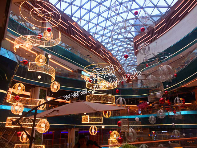 商場(chǎng)上空采用透明的玻璃制作,人們抬頭就可以看到藍(lán)天白云,陽(yáng)光可以直接灑下來(lái),整個(gè)商場(chǎng)通透明亮如同戶外,整體給人一片舒適的購(gòu)物環(huán)境。依塔斯借助良好的采光在中庭懸掛暖色的燈光裝飾及彩色的球體給原本空曠的中庭增添別樣的景致。中庭美好的裝飾既能美化環(huán)境還可以使人放松愉悅。大紅色和金色的點(diǎn)綴襯托開業(yè)當(dāng)天熱鬧喜慶的氛圍,也預(yù)示著新的一年紅紅火火的景象。