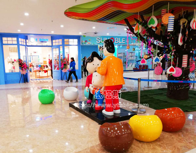 ? ? 12月29日,萬眾期待的陜西中聯(lián)新里城購(gòu)物中心盛裝亮相,寶雞首家一站式家庭型全業(yè)態(tài)時(shí)尚購(gòu)物中心。為打造新里城商場(chǎng)親子主題樂園,商場(chǎng)采用玻璃鋼制品制作大頭兒子小頭爸爸圍裙媽媽動(dòng)漫雕塑造型擺件,作為商場(chǎng)dp點(diǎn)美陳展示,結(jié)合多彩棒棒糖、蘋果凳等玻璃鋼擺件,營(yíng)造陜西新里城親子氛圍。