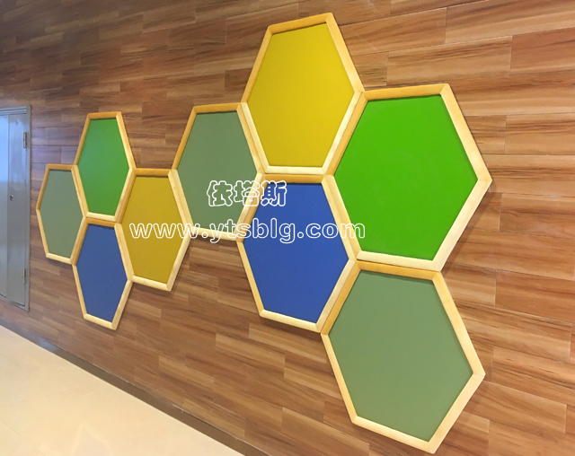 ? ? 這組正多邊形的背景墻長7米、高3米,分別由9個(gè)直徑為900mm的正多邊形彩色框進(jìn)行組合裝飾。其中外框采用12mm木質(zhì)夾板邊框加軟包,表面采用彩色噴繪貼紙裝飾。淺色的木框與深色的背景形成明顯的層次感,深藍(lán)色、亮黃色和淺綠色形成強(qiáng)烈的色彩對(duì)比,亮麗的顏色充滿活力。空白的彩色框,簡單明了,缺極具空間幾何感,整體效果非常時(shí)尚。