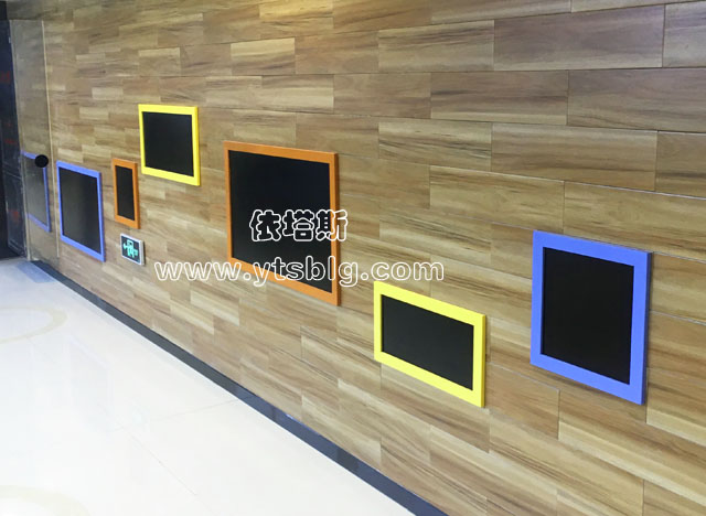 ? ? 兒童趣味墻由矩形框進(jìn)行裝飾,藍(lán)黃相間的彩色框邊寬40mm,規(guī)格有1000*600mm、800*400mm、600*300mm、400*400mm等隨機(jī)組合而成,表面采用黑色貼紙,可供兒童們在上面進(jìn)行作畫。簡單的裝飾讓墻面不再孤單,無形中還可以與顧客進(jìn)行互動(dòng),非常人性化的設(shè)計(jì)讓空間更富創(chuàng)意和趣味性。這樣的裝飾不僅工序簡單,環(huán)保、后期的可創(chuàng)造性強(qiáng),是非常不錯(cuò)的墻面裝飾品。