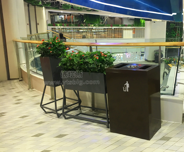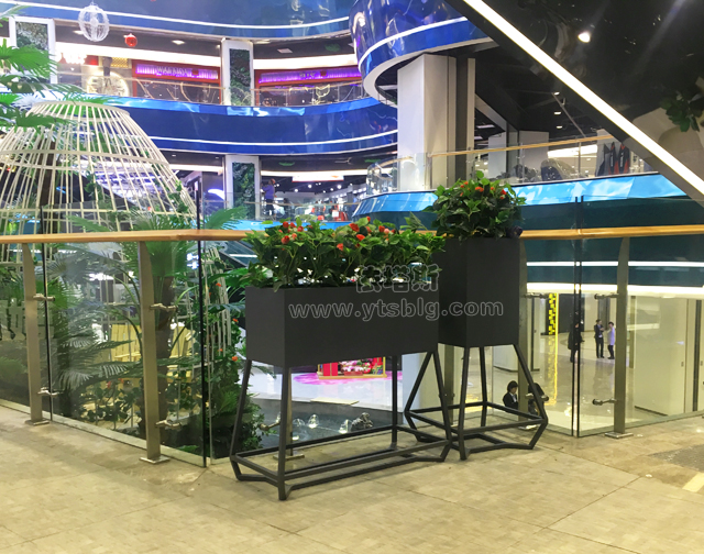 ? ? 這組極具幾何感的花盆,主體花槽部分尺寸設計偏小,鏤空的鐵制腳支撐,不但節(jié)省材料而且整體給人輕盈感與時尚感。冷靜的灰色搭配翠綠的盆栽給人滿滿的清新,別具一格的設計無不體現商場的現代感。它們既是花盆用來凈化和美化環(huán)境,本身也是藝術品具有一定的造景功能,時尚與優(yōu)雅并存,非常適合現代商業(yè)空間。