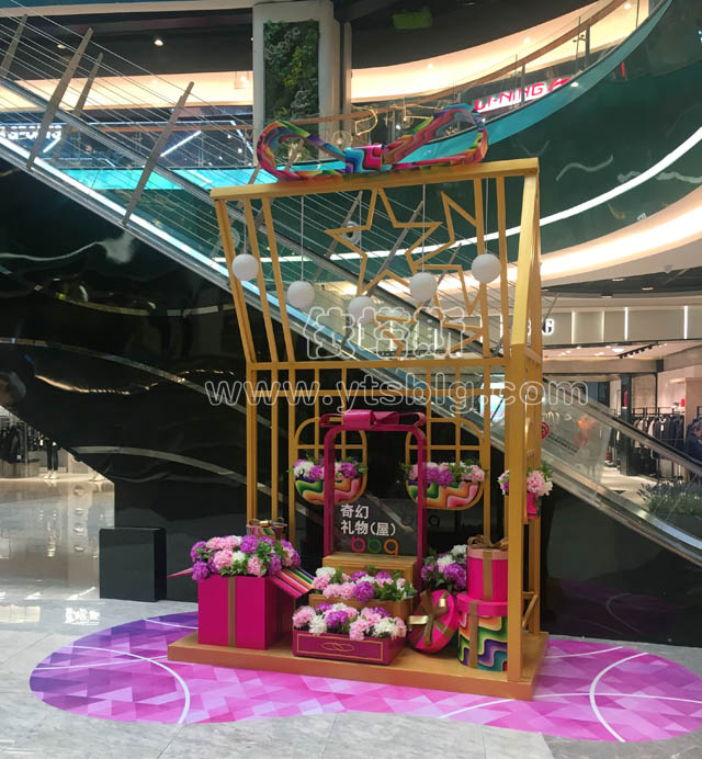 ? ? 步步高商場(chǎng)這次母親節(jié)也不例外,由深圳依塔斯為其設(shè)計(jì)安裝的DP點(diǎn)裝飾成為商場(chǎng)母親節(jié)當(dāng)天最亮麗的風(fēng)景。整體造型呈房屋狀,金色的主體框架搭配時(shí)尚亮麗的漸變紫色,奢華而又極具女性特色的色彩搭配讓人滿心歡喜。造型頂端彩色條紋的蝴蝶結(jié)裝飾更是充滿了少女情懷,這也是每一位母親內(nèi)心的夢(mèng)想。