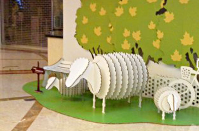這是英諾寶為萬(wàn)科地產(chǎn)制作,展出于兒童藝術(shù)中心門(mén)外的童趣美陳。逼真自然的道具全部為環(huán)保代木材料制作而成,一圈圈一層層的紙板被精準(zhǔn)切割成型,僅僅通過(guò)簡(jiǎn)單的拼接便化為一只只靈動(dòng)可愛(ài)的小羊和逼真繁茂的大樹(shù),惹人喜愛(ài)。