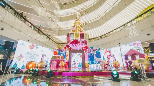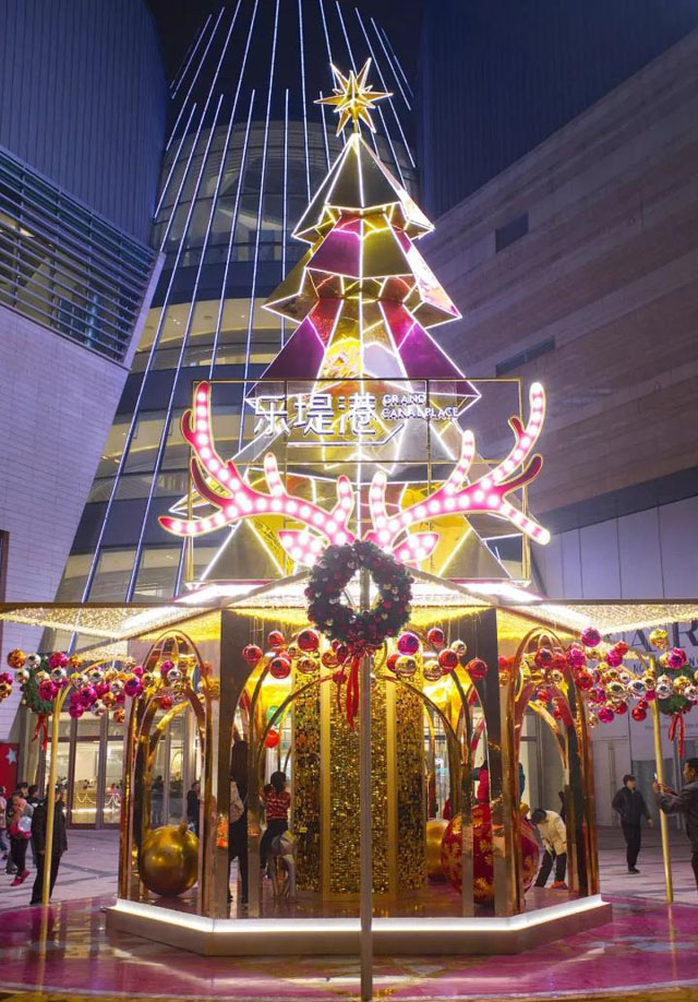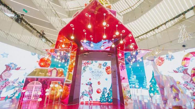 ? ? ? ? 中庭美陳裝飾的完美呈現(xiàn),點(diǎn)亮了的圣誕景觀和從魔法帽子里鉆出來的圣誕樹既是舞臺(tái)也是景觀。靚麗的色彩和形象生動(dòng)的造型給人一種極致的浪漫體驗(yàn)。