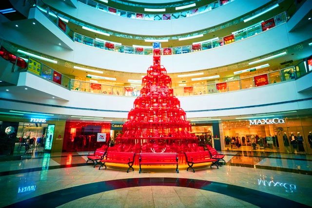 ? ? ? ? SM新生活廣場——今年SM的圣誕主題是嗨皮圣誕·藝樹之光,走進SM二期大中庭,就有一顆巨大的皮革圣誕樹映入眼簾,夜晚打開燈后——噔噔噔,華麗精致!讓Yes君沒想到的是,除皮革圣誕樹外,還有一棵巨大的紅椅子圣誕樹 ,每一張椅子,都有一句向網友征集的心里話,可以說,暖心又別具一格。