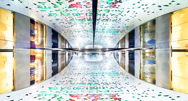 ? ? ? 這一做法致敬商場1894年的標(biāo)志性的彩色玻璃圓頂。整塊面紗重達(dá)24噸,看上去卻如同漂浮在玻璃地板和鏡面屋頂之間。