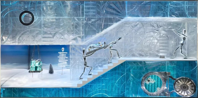 ? ? 今年的Tiffany櫥窗以其標志性的藍色盒子為主題。由Gene Moore操刀設計,陳列中的木人偶、冰雕等細節(jié)令人好奇又驚喜。