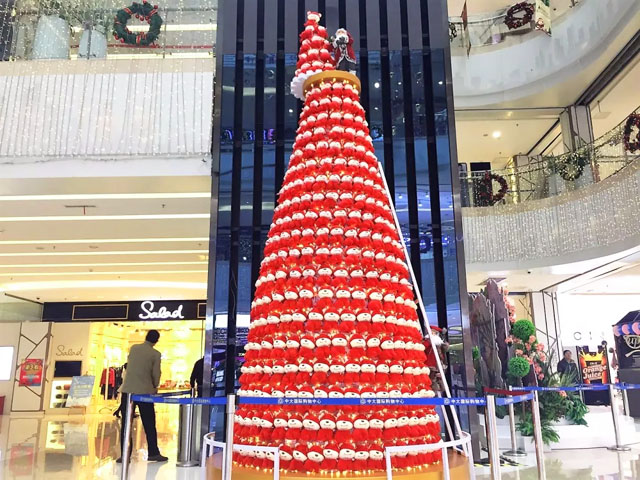 ? ? 圣誕美陳以中庭的圣誕樹為主,紅衣狗玩偶做成一個極高的圣誕樹,圣誕樹旁的梯子上,圣誕老人正在攀爬,圣誕樹頂還有一棵圣誕樹,一個圣誕老人。