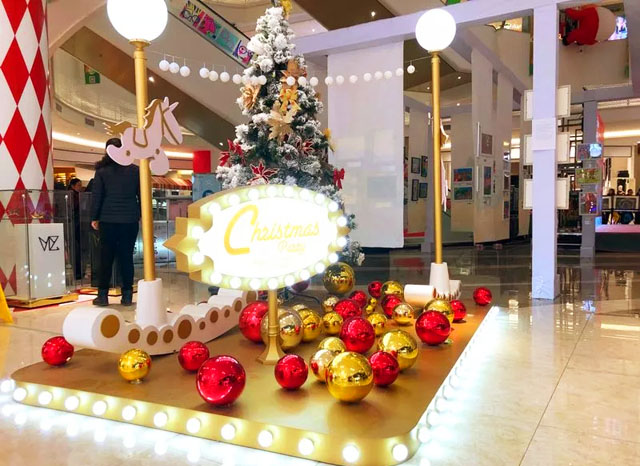 ? ? 世紀(jì)金源購物中心今年的圣誕節(jié)也是大手筆,從外廣場上美輪美奐的圣誕樹就可見一斑。金色麋鹿環(huán)繞著白色天鵝,上方升起一棵高高的圣誕樹,外環(huán)水晶球閃閃發(fā)亮。