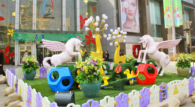 ? ? 由春天的花制成的鐵藝樹,滿滿都是春天的色彩;生動的白馬和可愛的小動物們聚集在樹下嬉鬧。商場的各個(gè)角落也都有春色點(diǎn)綴,讓顧客感受身邊的自然氣息。商場門前的綠色主題園藝布展,更富視覺沖擊力,將動物造型與創(chuàng)意花藝相結(jié)合,一清早就給人們帶來了足夠的驚喜。許多匆匆的路人都不由驚呼雀躍,競相駐足拍照,以此開啟一天明媚的心情。