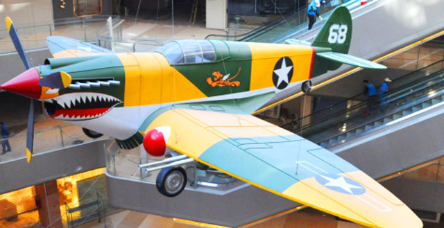 在一層購(gòu)物大廳,一架充滿濃郁二戰(zhàn)色彩的鯊魚頭戰(zhàn)機(jī)帶領(lǐng)消費(fèi)者穿越時(shí)空,回到那個(gè)戰(zhàn)爭(zhēng)但純真的年代。還有帶有工業(yè)氣息的炫酷雙翼戰(zhàn)機(jī),感受人類的偉大智慧。