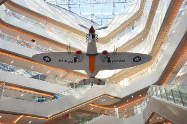 ? ? 在一層購物大廳,一架充滿濃郁二戰(zhàn)色彩的鯊魚頭戰(zhàn)機帶領(lǐng)消費者穿越時空,回到那個戰(zhàn)爭但純真的年代。還有帶有工業(yè)氣息的炫酷雙翼戰(zhàn)機,感受人類的偉大智慧。