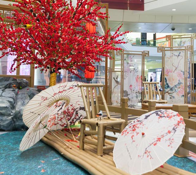 ? ? 最美“中國(guó)紅”,炮制傳統(tǒng)中國(guó)年。中國(guó)人喜歡紅色,不是淡紅、暗紅或粉紅,是正紅,從古至今,莫不如是,“正紅色”也被冠名為“中國(guó)紅”。因此,愛(ài)琴海購(gòu)物公園將此次春節(jié)營(yíng)銷主題命名為“2018紅到底”, 用“中國(guó)紅” 將春節(jié)氛圍體現(xiàn)得淋漓盡致。全場(chǎng)美陳無(wú)處不在的“紅”,大紅色的紙藝裝飾,不僅突出了春節(jié)熱鬧的氛圍,波浪形狀的折紙也讓整個(gè)裝飾充滿了藝術(shù)的律動(dòng)感,濃烈如贊美朝陽(yáng),絢麗如效仿晚霞。中庭的裝飾樹(shù)上,掛滿了象征團(tuán)圓意義的紅燈籠,樹(shù)下堆滿的紅色鞭炮,處處都散發(fā)著濃濃的年味。
